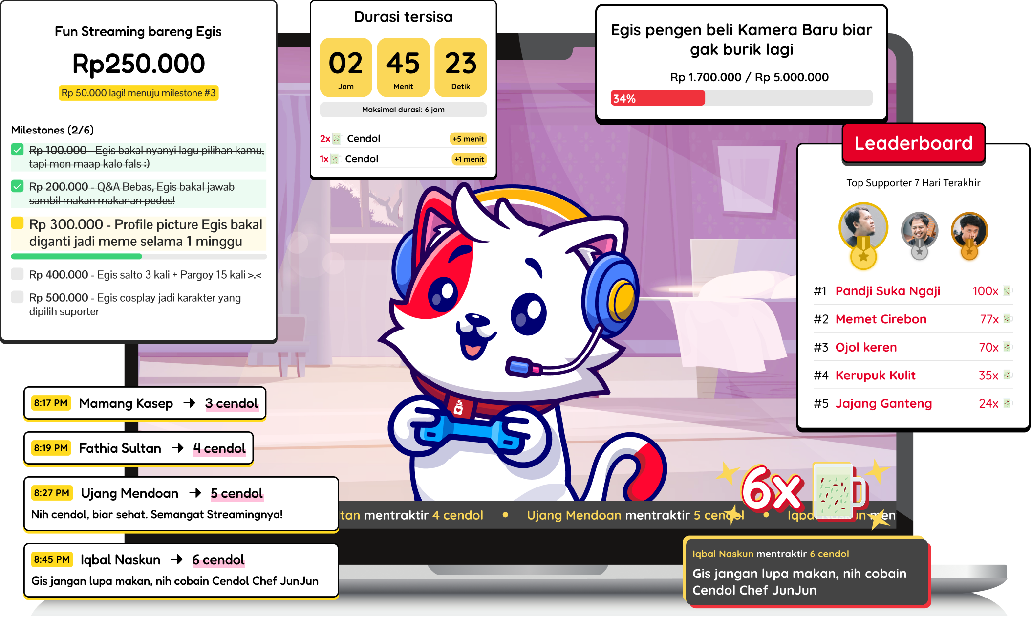 Warnai layar streaming kamu dengan widget overlay dari Trakteer seprti notification alert, milestone, leaderboard, dll. Trakteer akan terus menambah widget overlay dan temanya secara berkala biar kamu makin punya banyak pilihan untuk berinteraksi dengan para supportermu.